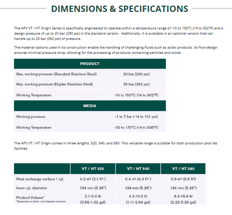 The APV VT / HT Origin scraped surface heat exchanger, operates on an adaptable platform and is specifically designed to operate under harsh conditions where other heat exchanger technologies may fail or lose operational efficiency over time. The APV VT / HT can be sold as equipment at the component level or as part of an APV system solution.
